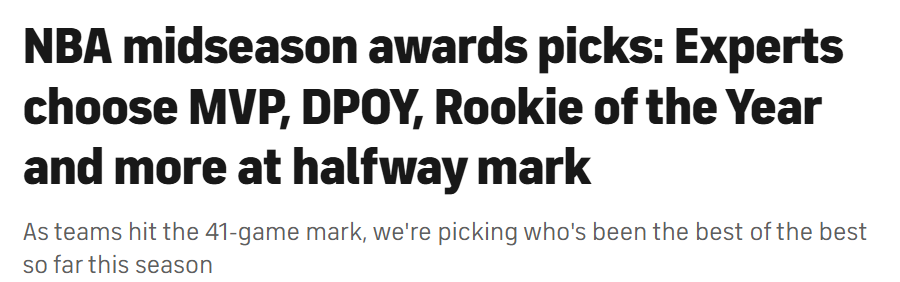 北京时间1月14日,NBA各支球队将在本周打完第41场比赛,CBS体育的6位专家也评出了各自心中的半程6大奖项的得主,具体得票如下——