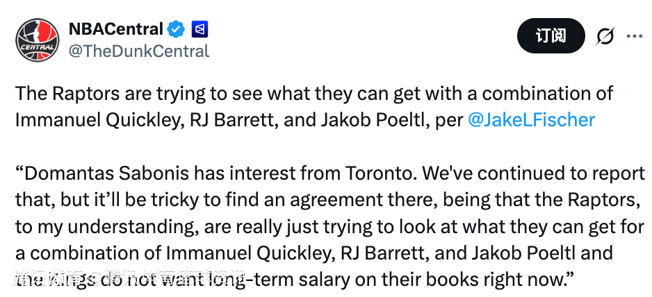 Fischer表示:“小萨博尼斯吸引了猛龙方面的兴趣。我们一直在报道这一点,但达成协议会很棘手。据我了解,猛龙队目前只是想评估这套三人组合的交易价值,而国王队现在并不希望账面上出现长期的薪资负担。”