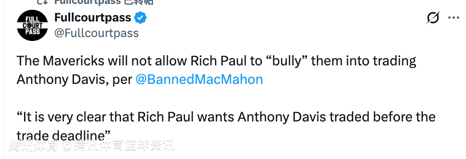 北京时间1月15日,据名记麦克马洪报道,独行侠队不会允许里奇-保罗通过施压的方式,迫使他们交易安东尼-戴维斯。