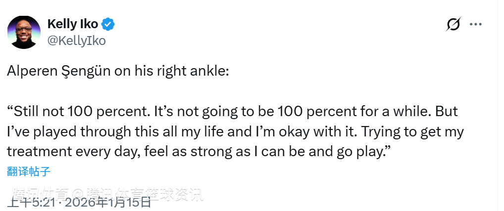 北京时间1月15日,火箭球星申京在接受采访时谈到自己的右脚踝伤势。
