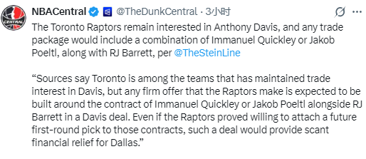 北京时间1月15日,据名记Marc Stein报道,猛龙队对安东尼-戴维斯的交易兴趣依旧浓厚,任何报价方案都将包含奎克利或珀尔特尔二选一,同时搭配巴雷特。