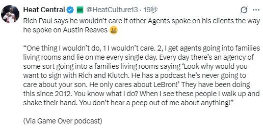 北京时间1月15日,知名经纪人里奇-保罗在直播节目中表示,即便其他经纪人用他谈论里夫斯的方式评价自己的客户,他也毫不在意。