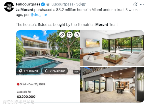据悉,目前莫兰特已经通过信托基金在迈尔密买下一套价值320万美元的房产,根据最新预测,莫兰特离队概率已经达到69%。