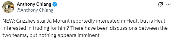 据热火记者Anthony Chiang报道,莫兰特对加盟热火队感兴趣,热火与灰熊进行了初步谈判,但目前还没有任何实质性进展;预计热火不会在莫兰特交易中加入任何选秀权或者任何优秀年轻球员,热火的报价很可能会围绕罗齐尔和丰泰基奥的到期合同展开。