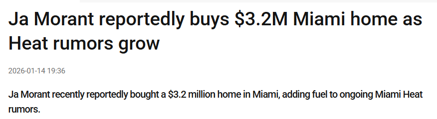 北京时间1月15日,灰熊球星莫兰特在场外的一举动引发全联盟关注。据热火内幕人士Dru Star透露,莫兰特已于三周前在迈阿密购置了一套价值320万美元的房产。