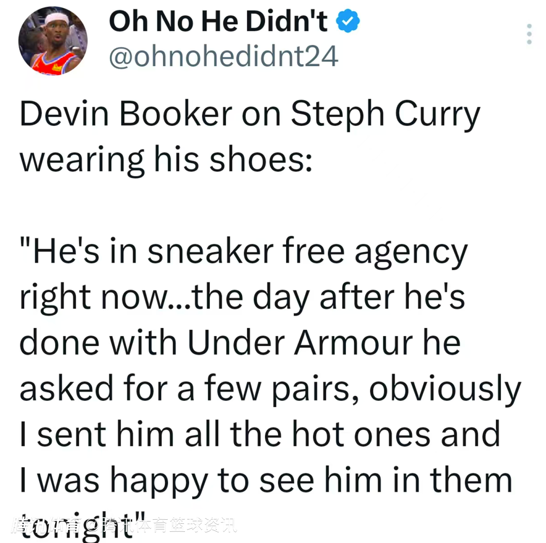 布克在谈到库里上脚自己的个人签名鞋Book 1时表示:“他现在处于球鞋合同自由身,肯定在试穿各家球鞋。他这赛季客场对战每支球队,都有上脚不同球鞋的小主题。和安德玛合同一结束,他就找我要了几双,我当然把最火的配色全寄给他了,今晚看到他上脚超开心。”