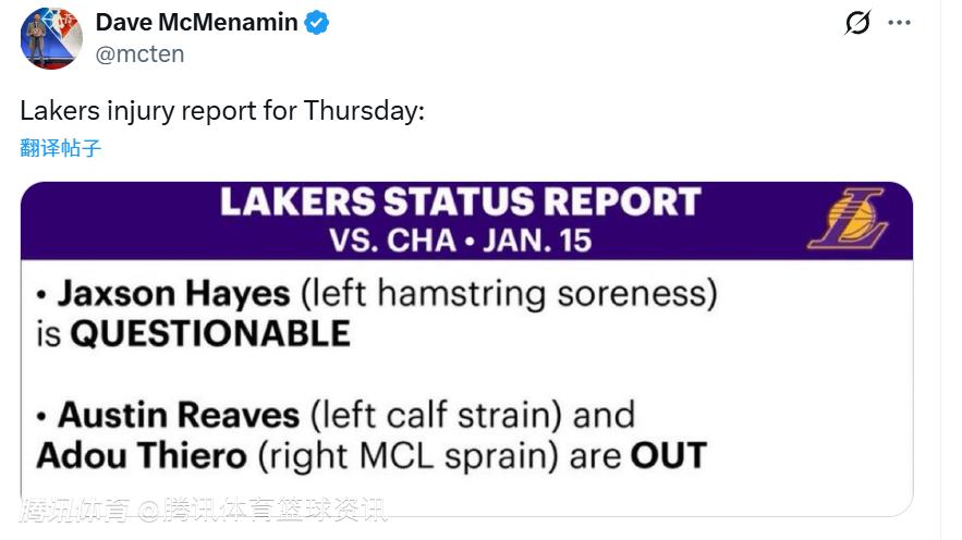 北京时间1月15日,NBA常规赛继续进行,湖人明日将对阵黄蜂。赛前,湖人方面更新本场比赛伤情报告。此前连续缺席9场比赛的里夫斯继续缺阵。