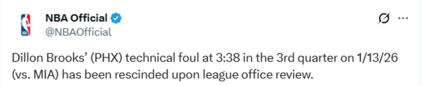 北京时间1月15日,NBA官方宣布,经联盟办公室审查,狄龙-布鲁克斯在1月14日对阵热火的比赛第三节3分38秒领到的技术犯规已被取消。