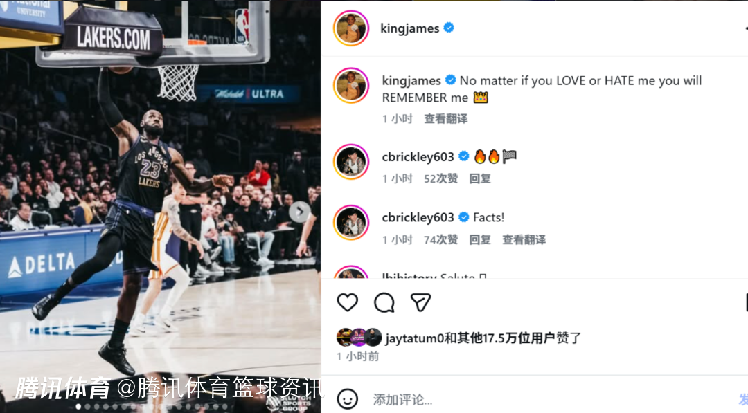 北京时间1月15日,今天詹姆斯更新社媒,晒出自己的比赛照,并且写道:“不管你爱我还是恨我,你都会记住我。”其中绿军球星塔图姆也点赞了该动态,另外,NBA知名训练师(特训过詹姆斯)Chris Brickley也现身评论区,表示支持。