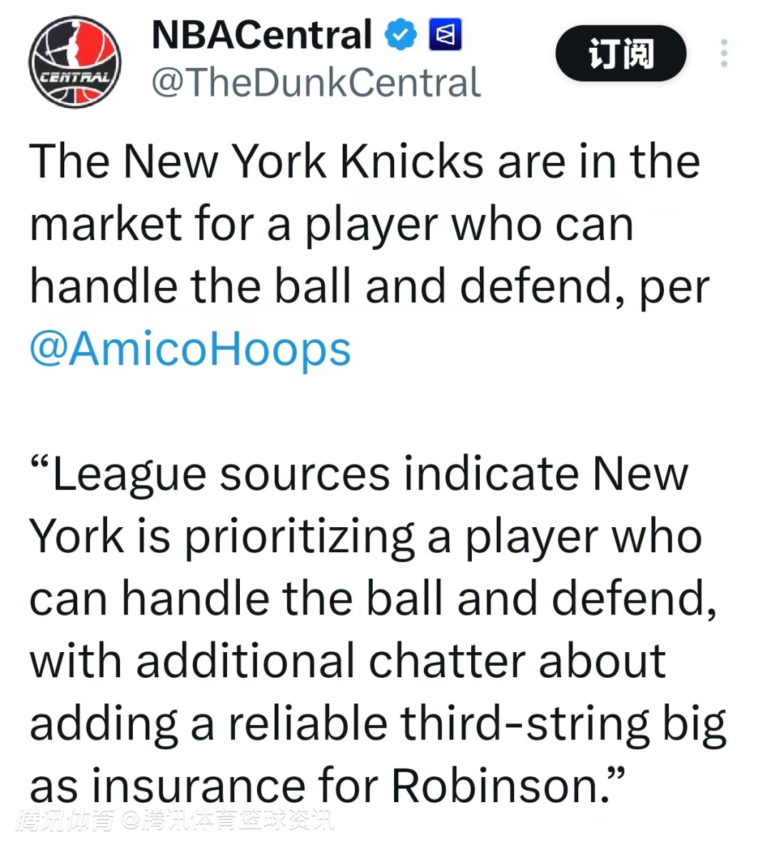 据联盟消息源透露,尼克斯将这类持球防守兼备的球员列为引援首要目标,同时坊间也有传闻,球队还计划签下一位靠谱的第三阵容内线,作为米切尔-罗宾逊的替补保障。
