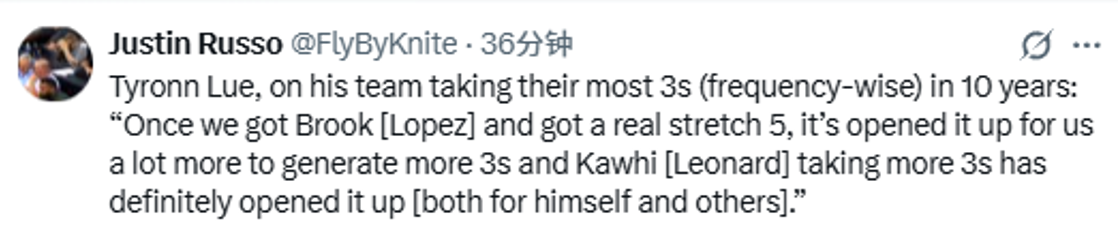 泰伦-卢在谈到球队三分出手数创10年新高时表示:“自从得到大洛,我们有了一位真正的空间型五号位,这为球队创造了更多三分机会。而莱昂纳德增加三分出手,无疑也为他自己和队友都打开了进攻空间。”