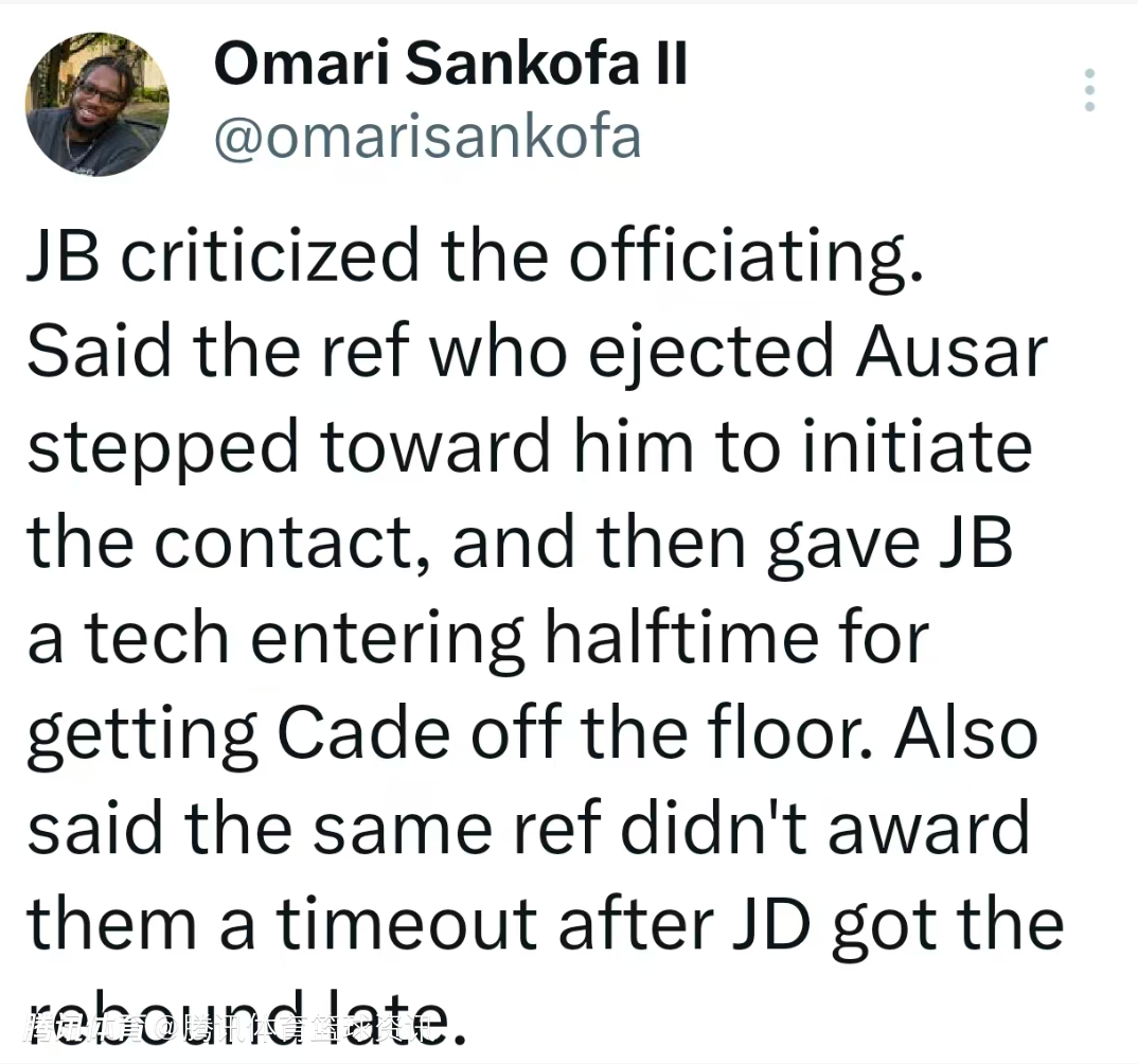 比克斯塔夫炮轰裁判判罚,他表示驱逐奥萨尔-汤普森的那名裁判主动上前与其发生身体接触,半场结束时又因自己搀扶坎宁安起身而吹罚技术犯规。比克斯塔夫还指出,末节末段杜伦抢下篮板后,该裁判未判给球队暂停。