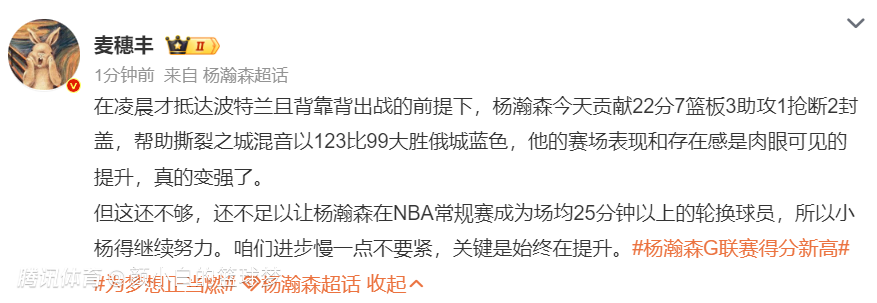 麦穗丰:杨瀚森22+7+3+1断2帽,他的赛场表现与存在感肉眼可见的提升,真的变强了。但这还不足以让他成为NBA常规赛场均25分钟以上的轮换,小杨还需继续努力。