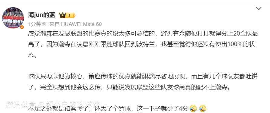 媒体人:感觉杨瀚森在G联赛没有太多可总结,比赛游刃有余得分上20全队最高,而且他还刚刚跟随开拓者从金州回到波特兰,我甚至觉得他都还没有100%发力。只要球队以他为核心就可以展示策应的优点,而且几个队友球商跟不上还连续吐饼。