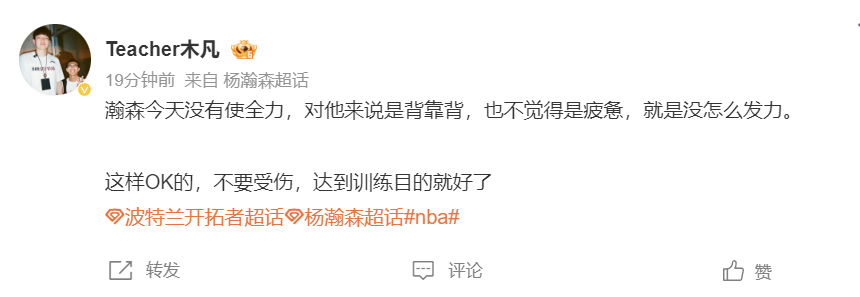木凡:这场比赛感觉杨瀚森没有发全力,对于他来说是背靠背也不是觉得疲累就是觉得没怎么发力,不要受伤,达到训练目的就可以。