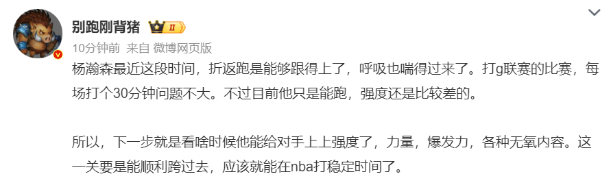 这场比赛国内的媒体人开始为小杨点赞,别跑刚背猪:杨瀚森这段时间折返跑跟得上了,呼吸也喘的过来。G联赛的比赛打30分钟不是问题,不过他的强度还是比较差,下一步就是提升强度,力量、爆发力各种无氧内容,这一关只要顺利跨过去,应该就可以在NBA打稳定时间。