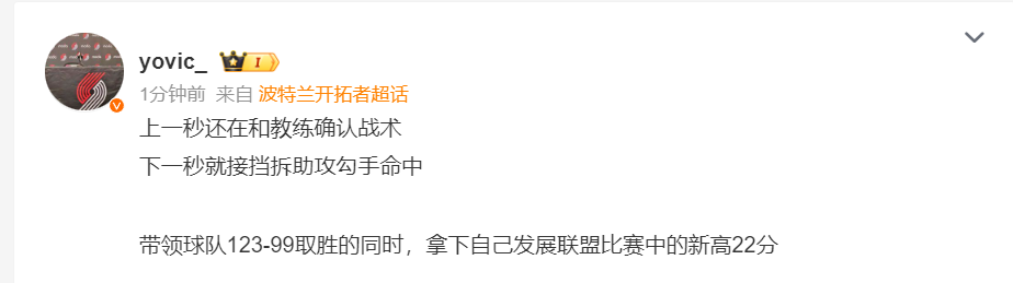 开拓者记者:上一秒还在跟教练确认战术,下一秒杨瀚森就接挡拆助攻勾手命中。(杨瀚森的英文能力也已经提升)