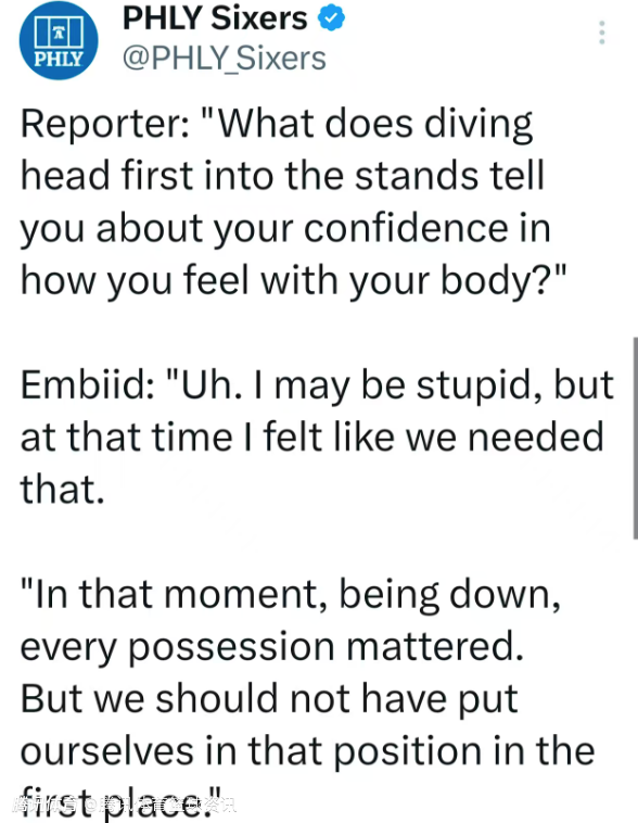 恩比德道:“额,我可能是有点傻,但当时我觉得球队需要这个球。那个时刻,我们正处于落后,每一个回合都至关重要。但话说回来,我们从一开始就不该把自己逼到那种境地。”