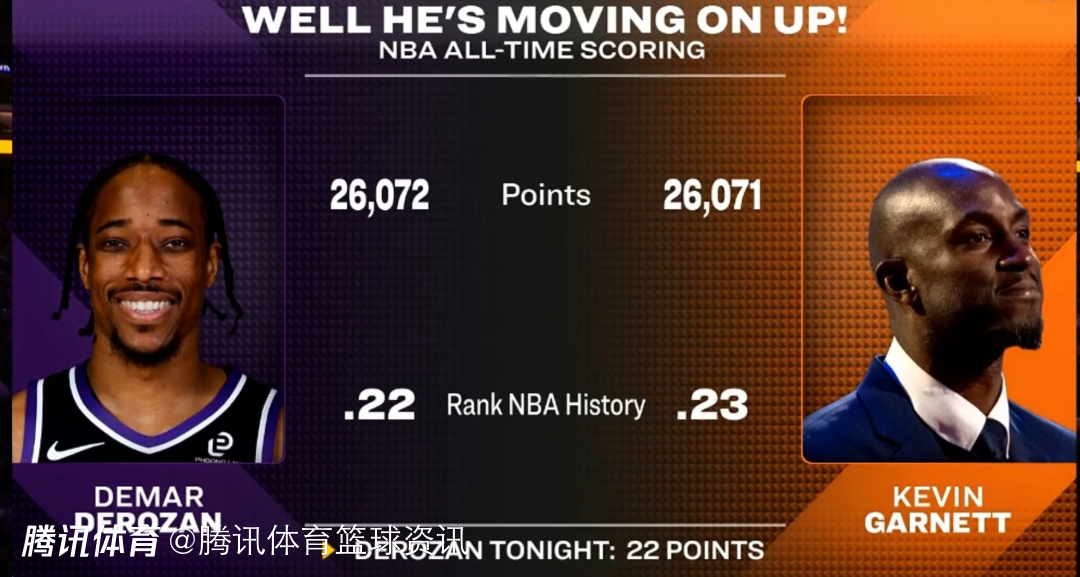 北京时间1月15日,NBA常规赛,国王对阵尼克斯,德罗赞在本场比赛迎来里程碑,让自己生涯总得分超越加内特,升至历史第22位。