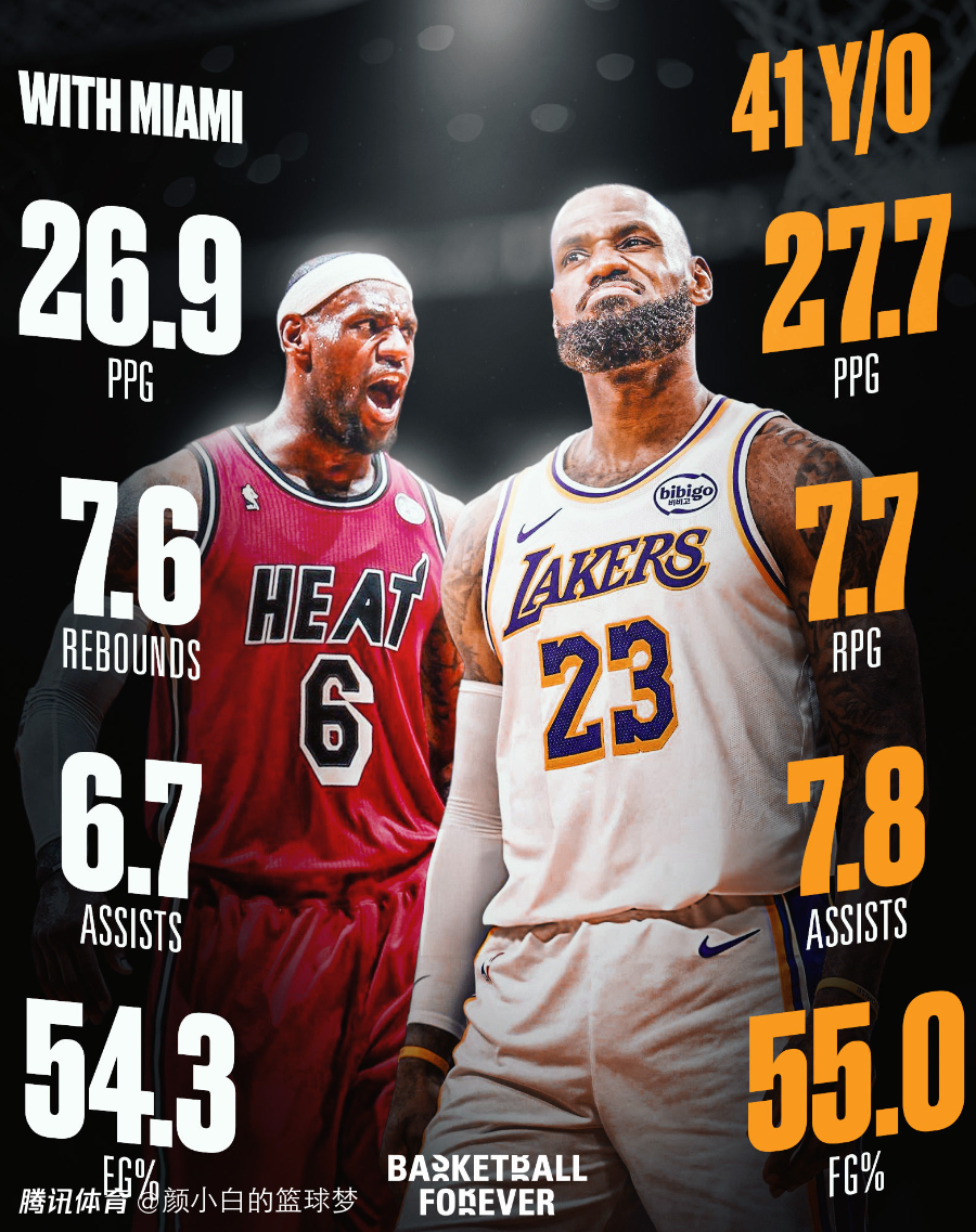 年满41周岁后,勒布朗场均27.7分7.7篮板7.8助攻1.3抢断0.3盖帽,命中率55%,谁能想到41岁的勒布朗比热火27-28的勒布朗数据还要出色一点?