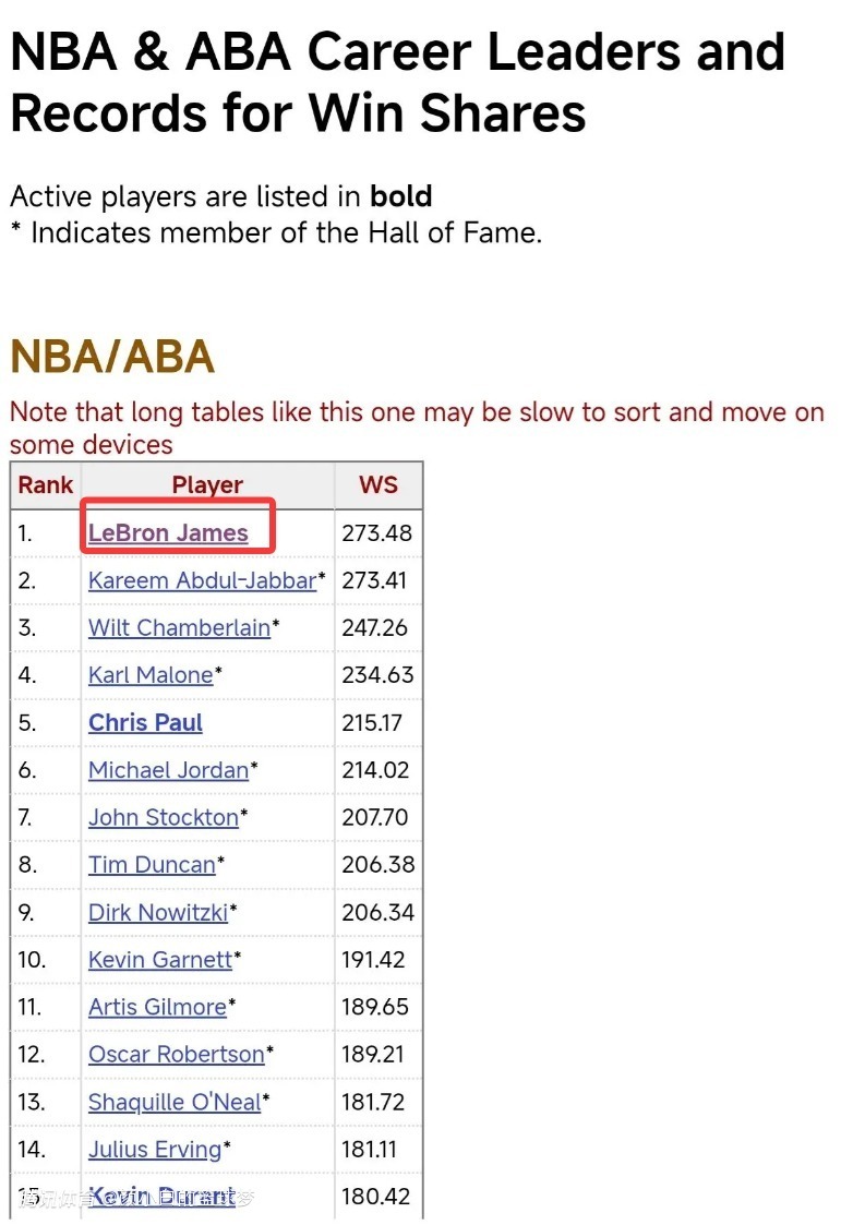 这场比赛后詹姆斯的常规赛Winshare(胜利贡献值)已经超过天勾贾巴尔登顶历史第一,詹姆斯是273.48,贾巴尔273.41,接下来勒布朗的每一场比赛都会刷新胜利贡献值历史新高,他再度成为行走的纪录产生仪。