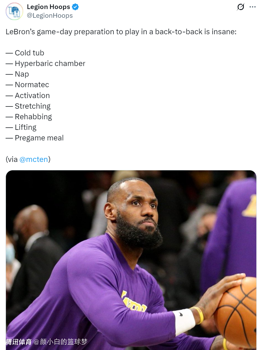 戴夫-麦克梅纳明透露过41岁的詹姆斯为了出战背靠背两场比赛有多么的自律:冷水澡、高压氧舱、小睡、玩一会游戏、冰敷膝盖45分钟、拉伸、康复治疗、力量训练、赛前餐。