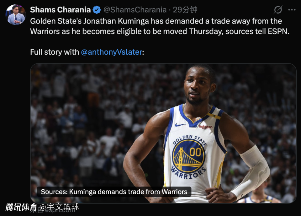 北京时间1月16日,据名记Shams和Anthony Slater的联合长文报道,勇士前锋库明加在符合交易资格的第一天,他向球队正式递交了交易申请。而本赛季的交易截止日是当地时间的2月5日。