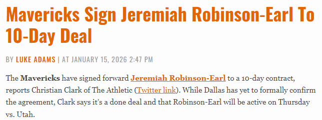 北京时间1月16日,据The Athletic记者Christian Clark报道,独行侠已与前锋杰里迈亚-罗宾逊- 厄尔签下一份10天短合同。尽管独行侠方面尚未正式确认这笔签约,但Clark表示交易已成定局,罗宾逊-厄尔将出战对阵爵士的比赛。