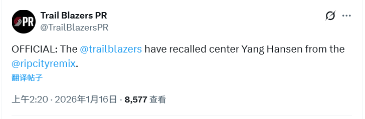 北京时间1月16日,开拓者官方宣布从混音召回了杨瀚森,这意味着他有望出战今日对老鹰的比赛。如果杨瀚森在这场比赛中登场,他将连续三天打比赛。