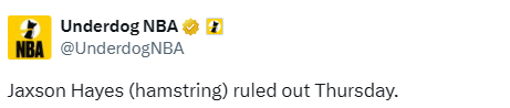 北京时间1月16日,NBA常规赛继续进行,湖人对阵黄蜂。赛前,湖人方面更新本场比赛伤情报告,球队内线海斯因左腿筋酸痛确认缺席本场比赛。