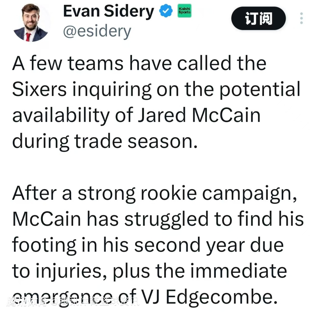 北京时间1月16日,据记者Evan Sidery报道,有消息源透露,交易截止日期间,已有数支球队致电76人,询问麦凯恩的潜在交易可能性。