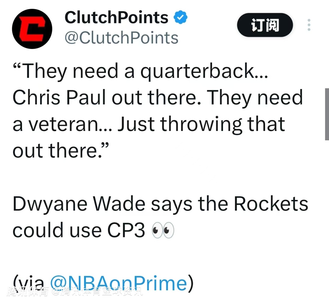 北京时间1月16日,NBA名宿韦德在参加直播节目时表示,火箭需要保罗这样的球场指挥官。