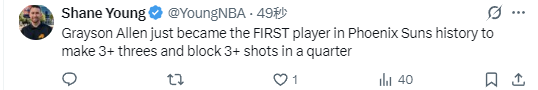 首节比赛中,阿伦7投4中(三分球6投3中)得到了13分4篮板3盖帽,根据数据统计显示,阿伦是太阳队历史上首位能在单节比赛中投中至少3记三分球并送出3+盖帽的球员。
