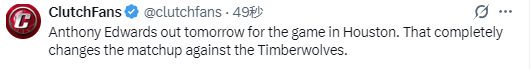 北京时间1月16日,森林狼队发布了明日对阵火箭队比赛的伤病报告,其中爱德华兹因伤将缺席本场比赛,具体情况如下: