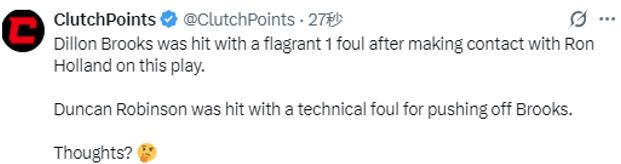 北京时间1月16日,NBA常规赛继续进行,太阳队对阵活塞队。在上半场比赛末尾,场上连续出现大动作犯规,狄龙-布鲁克斯被吹罚一级恶意犯规,邓肯-罗宾逊和斯图尔特各自吃到技术犯规。
