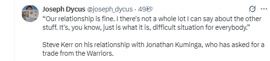 此前,库明加向勇士队提交了交易申请。谈到此事时,科尔表示:“我们的关系没什么问题,其他事情我没太多可说的,事实就是如此。对所有人来说这都是个艰难的处境,我们唯有继续前行。这件事与你们无关,我们今早聊过,所有内容均为私人谈话,这件事不会成为球队的干扰。”