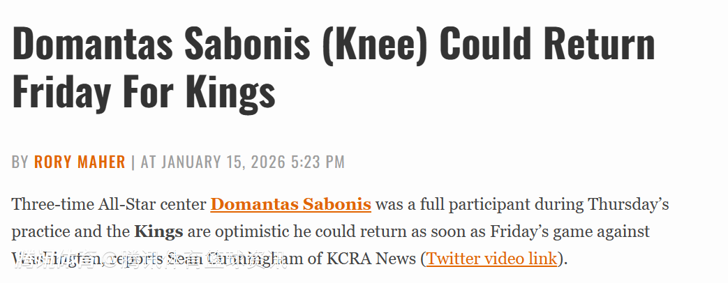北京时间1月16日,据队记Sean Cunningham报道,三届全明星中锋小萨博尼斯在此前的训练中完成了全部训练内容,国王队对他能在明日对阵奇才的比赛中复出持乐观态度。