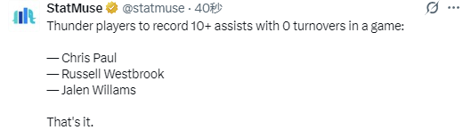 北京时间1月16日,NBA常规赛继续进行,雷霆队111-91大胜火箭队。本场比赛,雷霆队的杰伦-威廉姆斯11投2中得到6分5篮板10助攻1盖帽,但没有出现失误。根据数据统计显示,杰伦-威廉姆斯是雷霆队历史上第3位单场10+助攻且0失误的球员,前两位是威斯布鲁克和保罗。