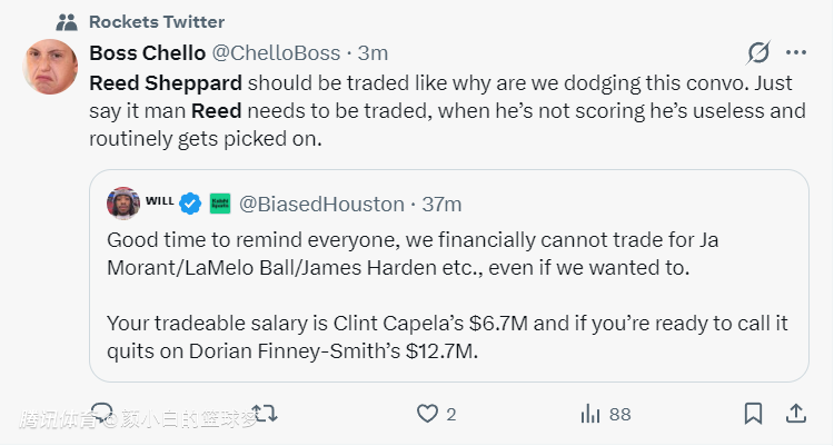 休媒:我提醒一下大家,从薪金的角度来看,我们没有可能交易得到莫兰特、三球、哈登这样的球员,我们可以交易的资产卡佩拉670万、芬尼史密斯1270万而已。