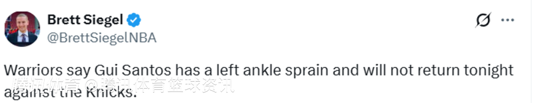 北京时间1月16日,NBA常规赛,勇士主场对阵尼克斯,勇士球员桑托斯在首节伤退,据最新消息,桑托斯遭遇左脚踝扭伤,本场比赛不会回归。
