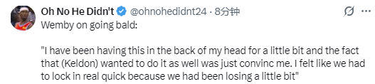 在谈到自己剃光头一事时,文班亚马说道:“我心里琢磨这事有一阵子了,凯尔登-约翰逊也想一起剃,这下我就彻底下定决心了。当时球队正遭遇一波连败,我觉得我们必须立刻找回专注的状态。”