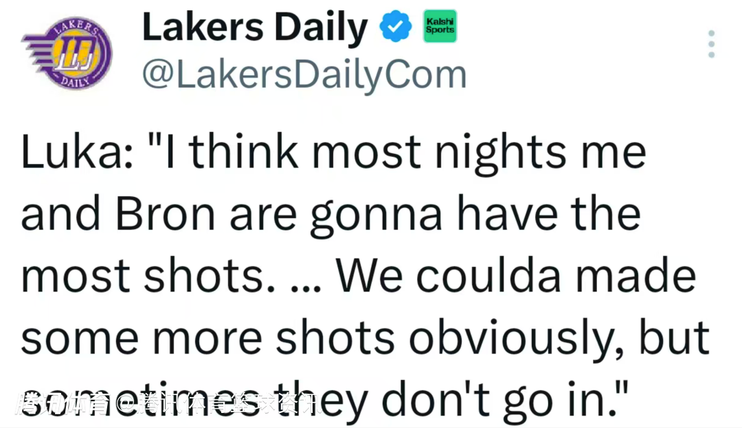 关于比赛失利,东契奇说道:“我觉得大多数夜晚,我和老詹都会是出手最多的人。很明显,我们本可以投进更多球,但有时候球就是不进。对手投进了很多球,我们也因此丢了很多篮板。”