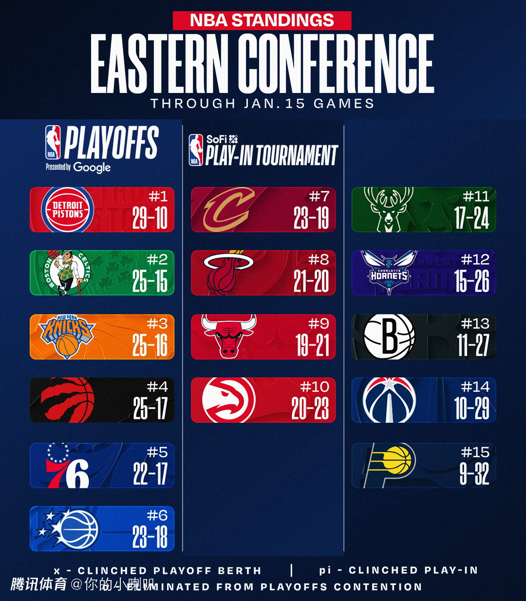 东部,活塞第一,凯尔特人升至第二,尼克斯输给勇士,降至第三,猛龙第四,雄鹿第11,距离第十老鹰差2个胜场。