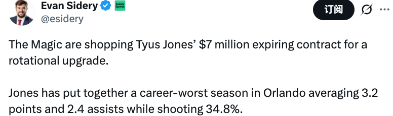 北京时间1月16日,据美记Evan Sidery报道,奥兰多魔术队正在兜售泰鲁斯-琼斯价值700万美元的到期合同,希望能以此升级球队的轮换阵容。