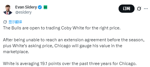 北京时间1月17日,根据记者Evan Sidery的报道,只要价码合适,公牛队愿将科比-怀特摆上货架。