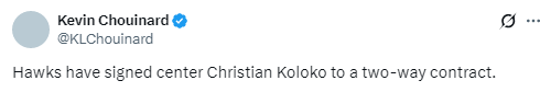 北京时间1月17日,据记者Kevin Chouinard报道,老鹰队以双向合同签下自由球员中锋克里斯蒂安-科洛科。老鹰队目前正好有空缺的双向合同名额,签下科洛科无需裁掉队内现有球员。