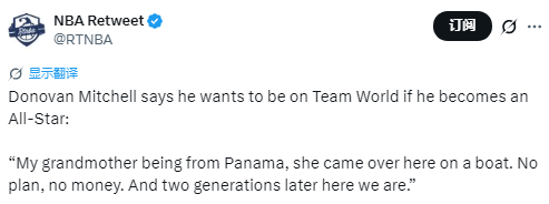 话题转向球队选择时,米切尔说道:“我的祖母来自巴拿马,她当年是坐船来到这里的,身无分文,也毫无规划。而仅仅两代人之后,我们就已经站在了这里。即便人们不把我当作巴拿马人,今年的全明星赛,我也希望能入选世界队。”