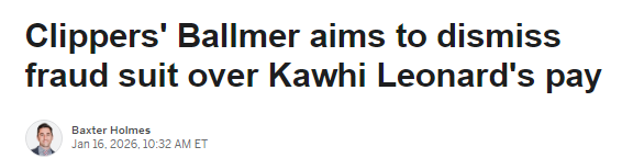 北京时间1月17日,ESPN发文报道,据法庭文件披露,快船老板鲍尔默的代理律师正寻求驳回一项针对他的欺诈诉讼。该诉讼指控鲍尔默通过一家现已倒闭的绿色金融公司暗中向球星莱昂纳德输送资金,律师团队斥这些指控耸人听闻且纯属捏造。