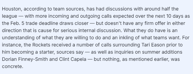 火箭记者Kelly Iko报道,多位消息人士透露,火箭已与联盟中约半数的球队进行过对话,随着2月6日交易截止日临近,未来10天内预计会有更多拨出与接听的电话——但目前尚未出现任何值得内部认真讨论的正式报价(无论是接收还是提出)。