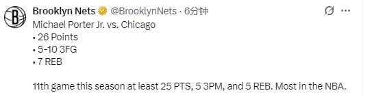 北京时间1月17日,NBA常规赛继续进行,篮网队112-109险胜公牛队。小迈克尔-波特此役17投9中(三分球10投5中)得到26分7篮板1助攻1抢断,在比赛最后时刻,小波特命中反超比分的上篮。